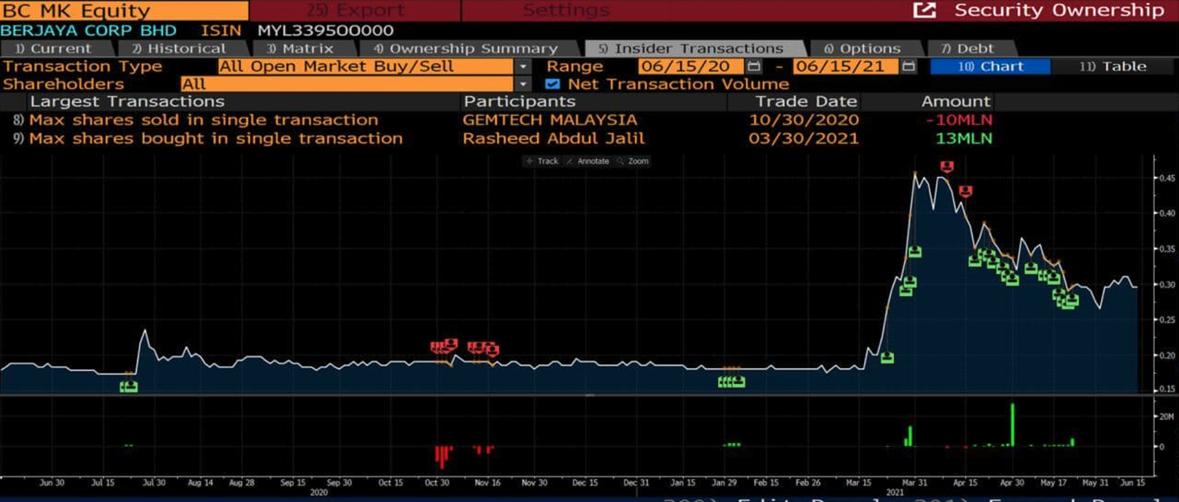 To be fair, there could be another legitimate reason why BJCORP’s shares are trading at such depressed levels – potential corporate governance (CG) risk. The legacy management team prior to this new one had a less-than-sterling reputation on the CG front; but the new CEO has directly addressed this in his LinkedIn article and by inviting 5 new independent directors to the board. He has himself also been on a buying spree, acquiring approximately 3.6% of outstanding shares by end-May (see Bloomberg chart below).