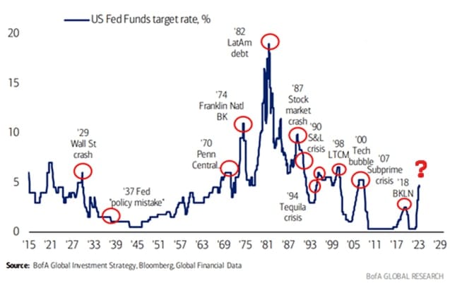 There is a famous chart from Bank of America, which shows how every major rate hiking cycle during the past half century, ended in some kind of crisis (LatAm Debt in '82, Market crash in '87, Tequila crisis in '94, LTCM in '98 etc). This cycle has seen the steepest and quickest increase in rates, not just in the US but across the world (with some notable exceptions in Asia). This monetary tightening takes place as the world has much more debt than before, while growth rates are lower than in the past. It also comes after a decade of ZIRP. I do not see how we do not end up in a crisis.