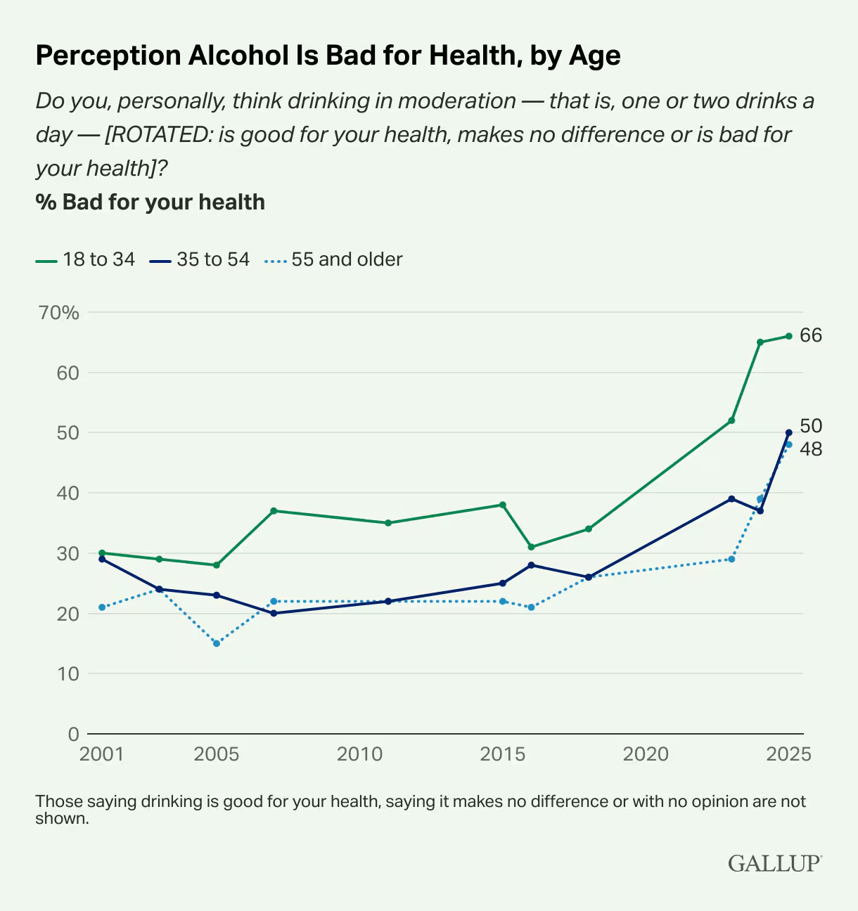 It's also possible that people are becoming better-informed now that they have instant access to generative AI tools in their pockets. Influencers such as Bryan Johnson have millions of YouTube subscribers and are inspiring others to take better care of their health. And indeed, a US Gallup survey shows that an increasing number of people see alcohol as being bad for their health, coinciding with the release of ChatGPT in 2022: