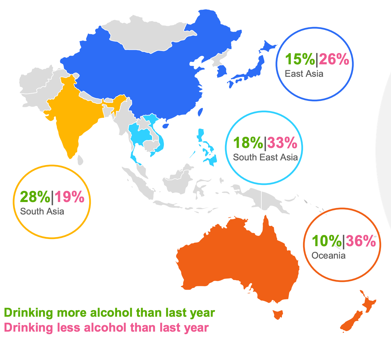 First, let's talk about the bear case. Nielsen IQ data shows that in Asia-Pacific, 30% are reporting drinking less, and only 15% more are reporting drinking more. The only exception is South Asia, where consumption levels remain low: