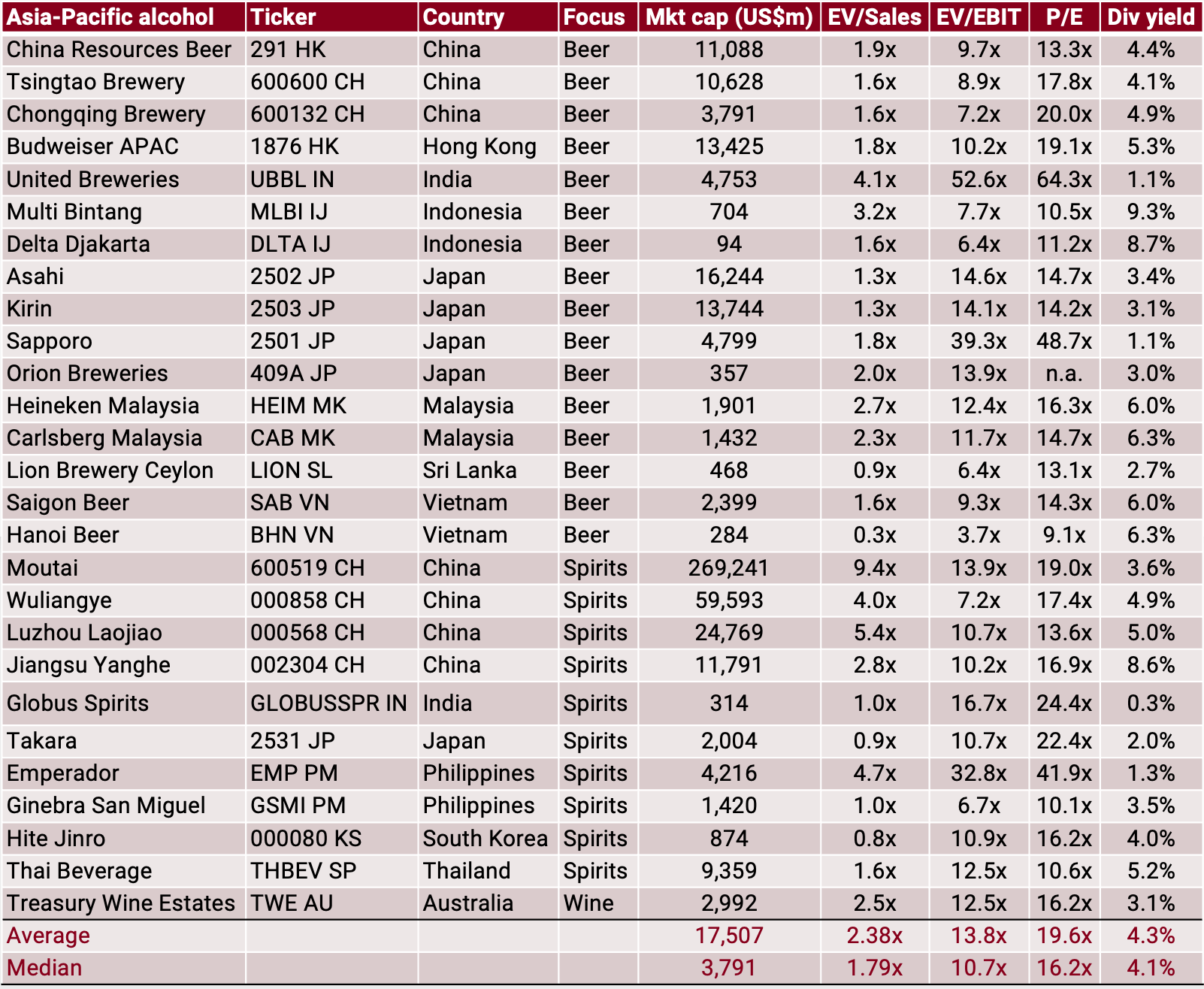 Growth in India is by far the healthiest. And that's reflected in the much higher valuation multiples for Indian alcoholic beverage companies. Kweichou Moutai is still growing its top line at a steady pace, and now trades at 19.0x P/E. A personal holding of mine, Ginebra San Miguel, continues to grow at double-digit rates, yet trades at just 10.0x P/E. Other stocks with low valuation multiples include the Chinese and Vietnamese beer brands, as well as Lion Brewery in Sri Lanka.