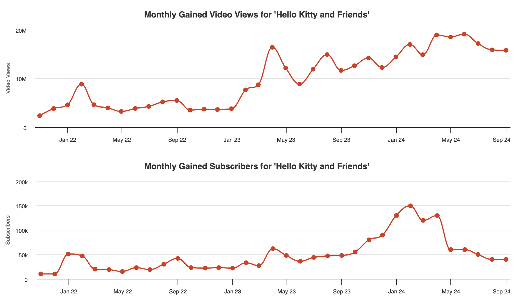 For example, when it comes to Hello Kitty, I searched on YouTube for the brand and found the channel Hello Kitty & Friends. It has 2 million subscribers and content published weekly. I then typed in “@hellokittyandfriends” in the search bar after selecting “YouTube” and was presented with two charts with monthly video views and monthly gained subscribers. The number of video views remains high, though the number of gained subscribers has dropped since late 2023, in line with weaker website traffic.