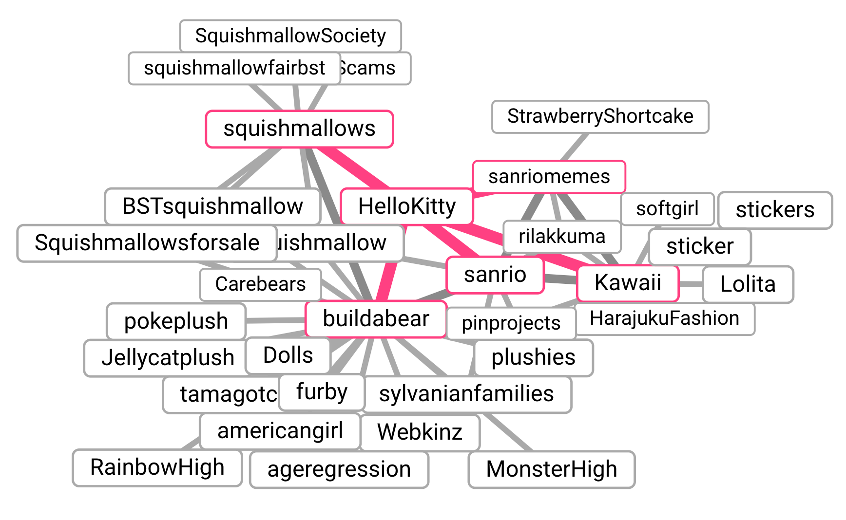 What I like to do next is to go to the Anvaka Github tool to understand what other Subreddits might be relevant for a particular brand or product. In Hello Kitty’s case, it becomes clear that the main Subreddits we’ll want to track are r/HelloKitty and r/Sanrio.