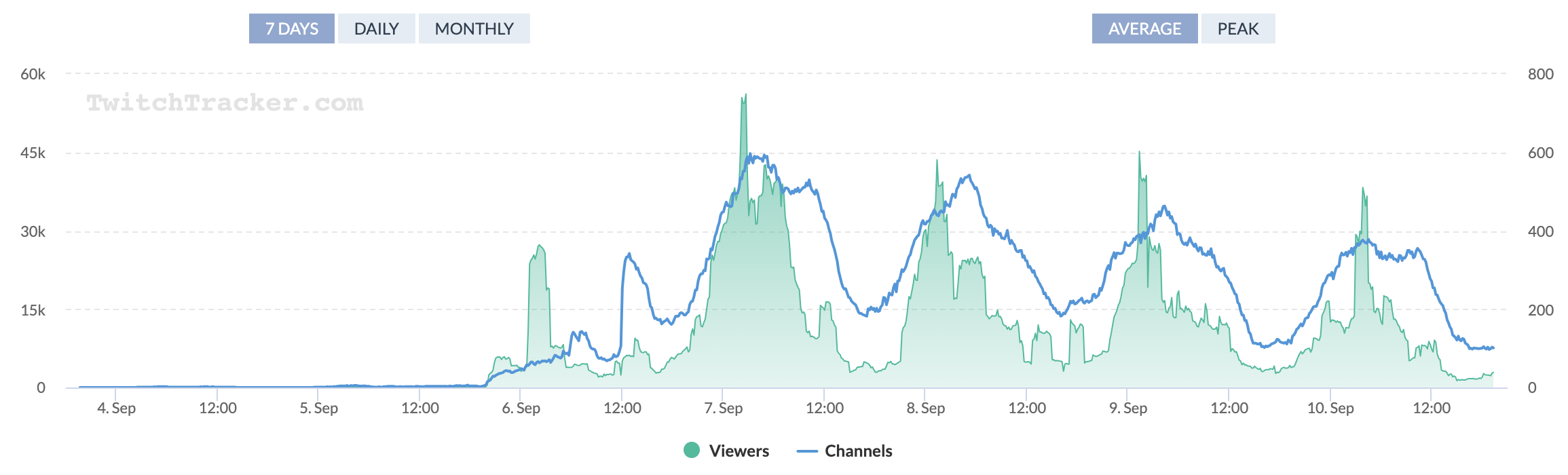 TwitchTracker provides the number of users for each channel at any given point in time. These statistics help you compare today’s viewership to that of other games and historically.