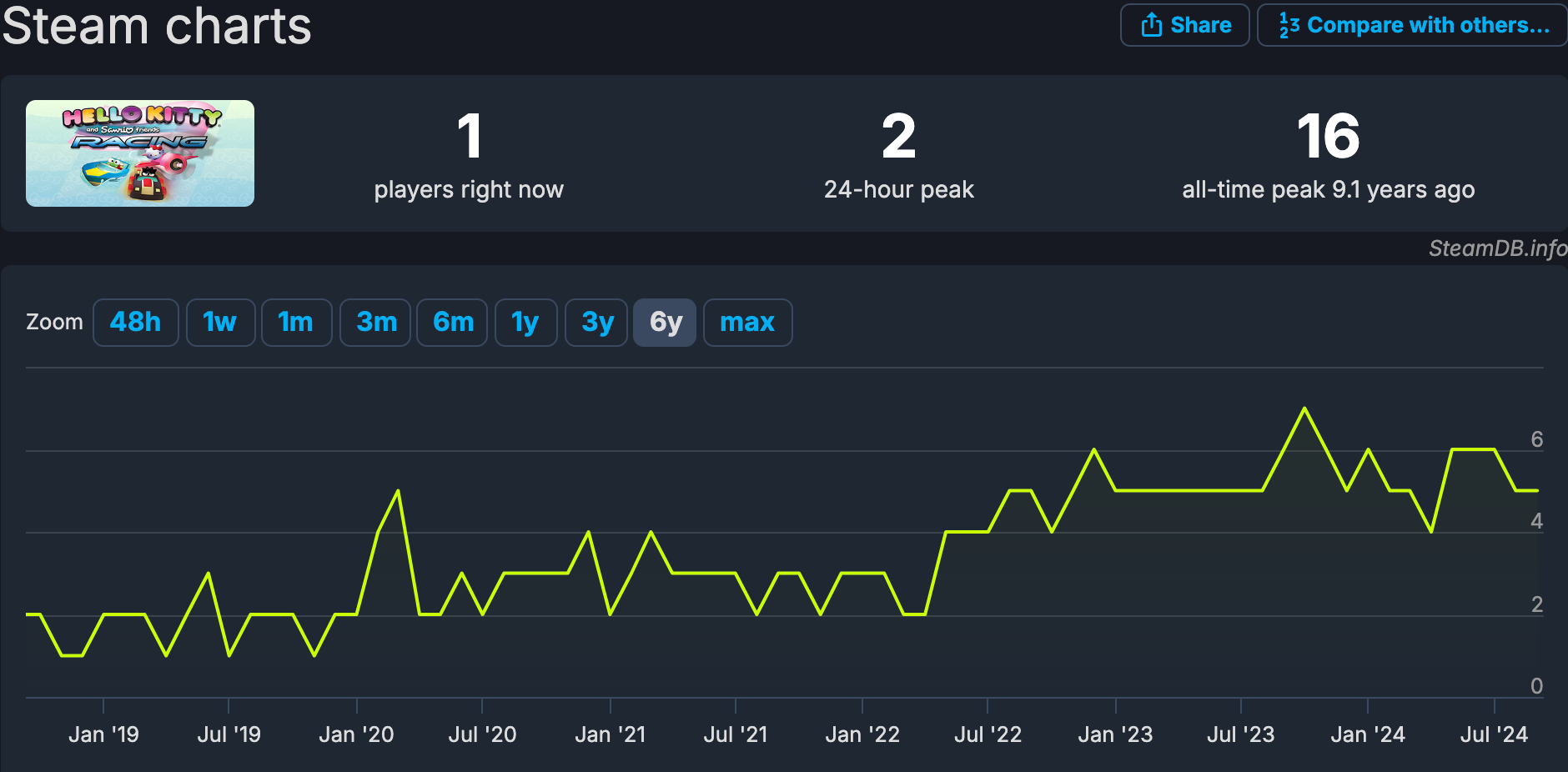 The only Hello Kitty-branded game I found was Hello Kitty and Sanrio Friends Gaming. The game only has one concurrent player globally, so this particular game clearly isn’t moving the needle for Sanrio. Had we been analyzing a video game developer, Steamdb would have been more helpful.