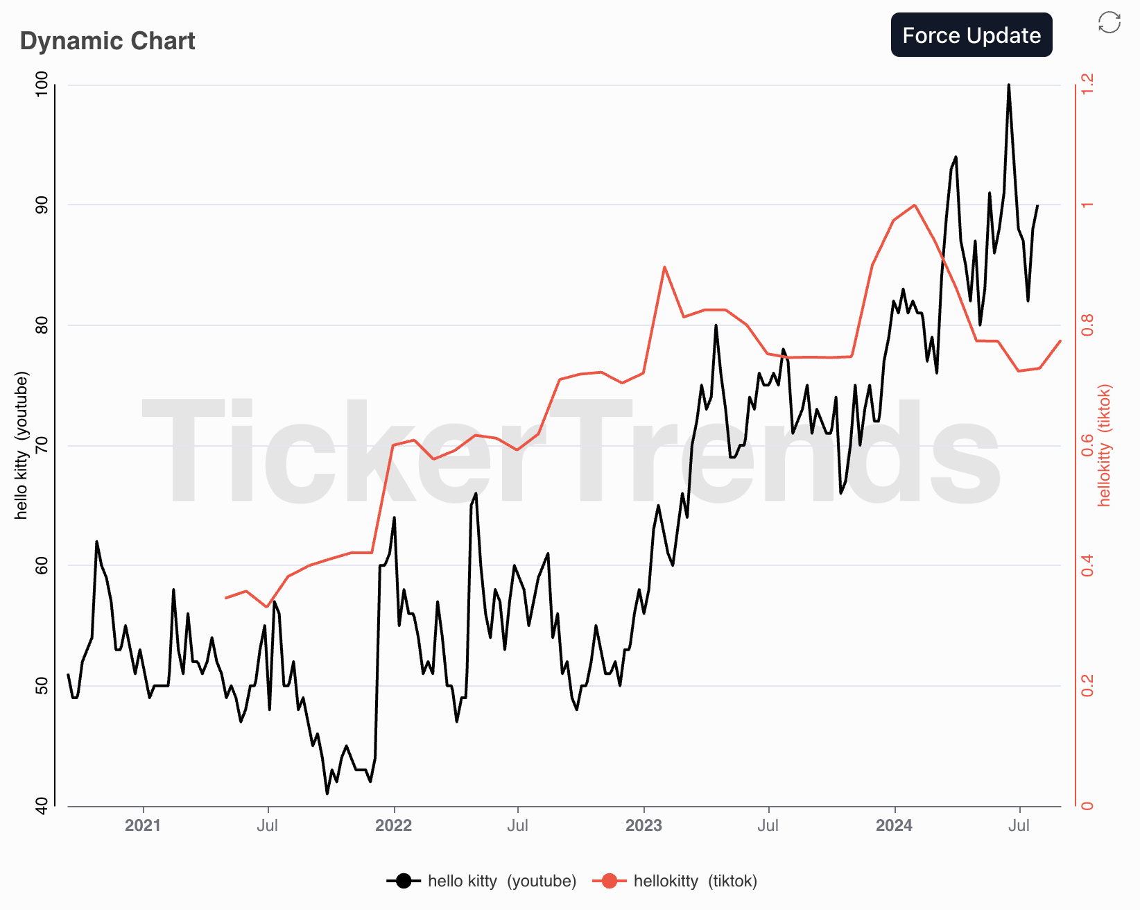 If you search for “Hello Kitty” on StockX, you’ll find a range of Hello Kitty-branded products. They’ve done a host of partnerships in the past few years years, with Nike and others. Scroll down to the bottom and you’ll find historical price charts for each of them. While prices for particular special editions can be volatile, by tracking a number of them you’ll get a feeling of whether a particular brand is popular.