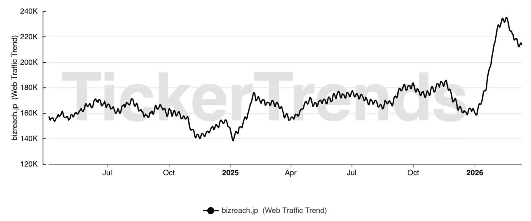 If you pay for Similarweb's standard plan, you'll get access to historical website traffic data. A cheaper alternative is to use alternative data platform Tickertrends instead. Paying subscribers to TickerTrends can search for Visional 4194 JP and then click "BizReach.jp" under the Web Traffic Trend heading. They'll then be presented with the following chart:
