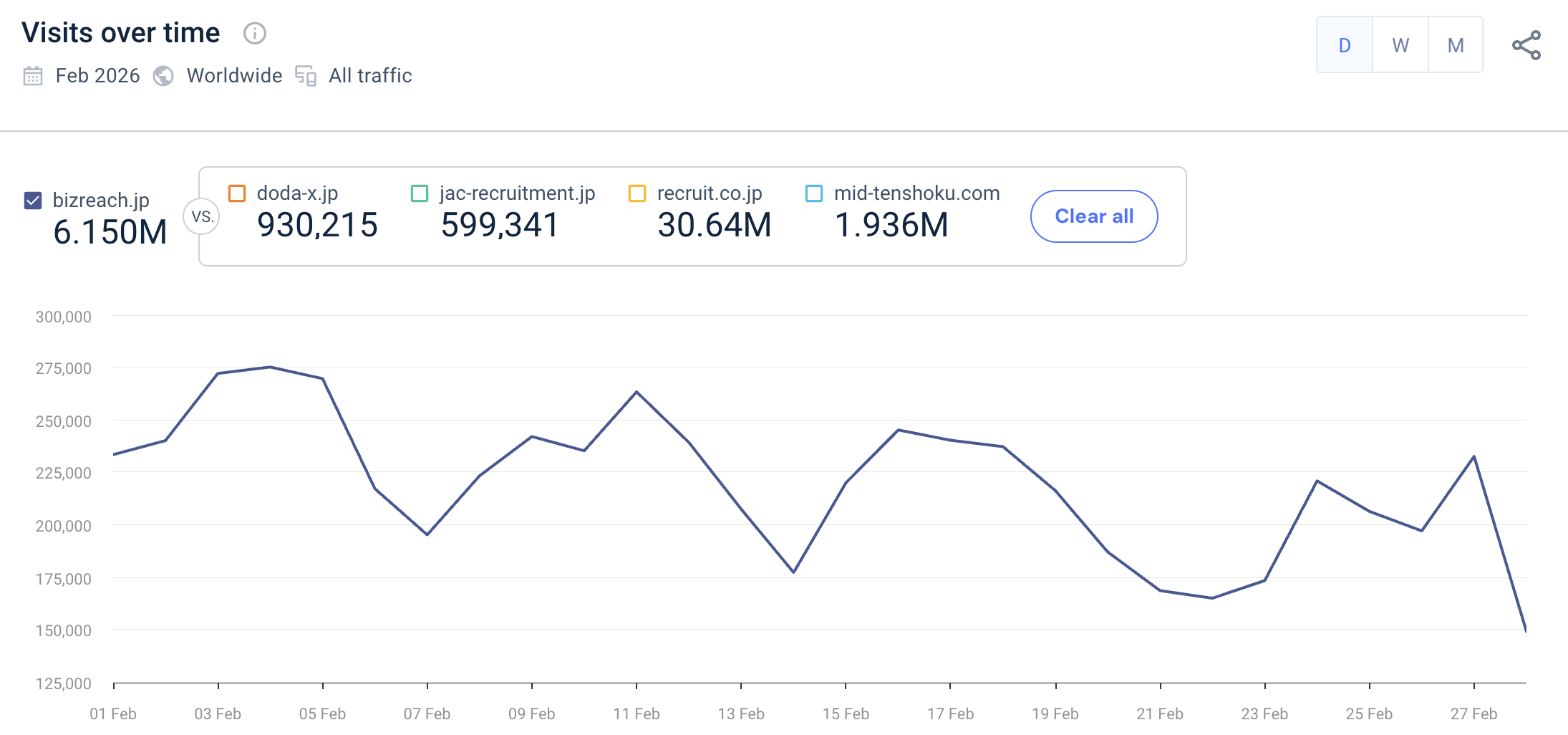 It shows that BizReach.jp had 6.15 million website visitors in February 2026, higher than mid-career headhunting website doda-x.jp but lower than the mainstream job board Recruit.co.jp. This is exactly what I would have expected.