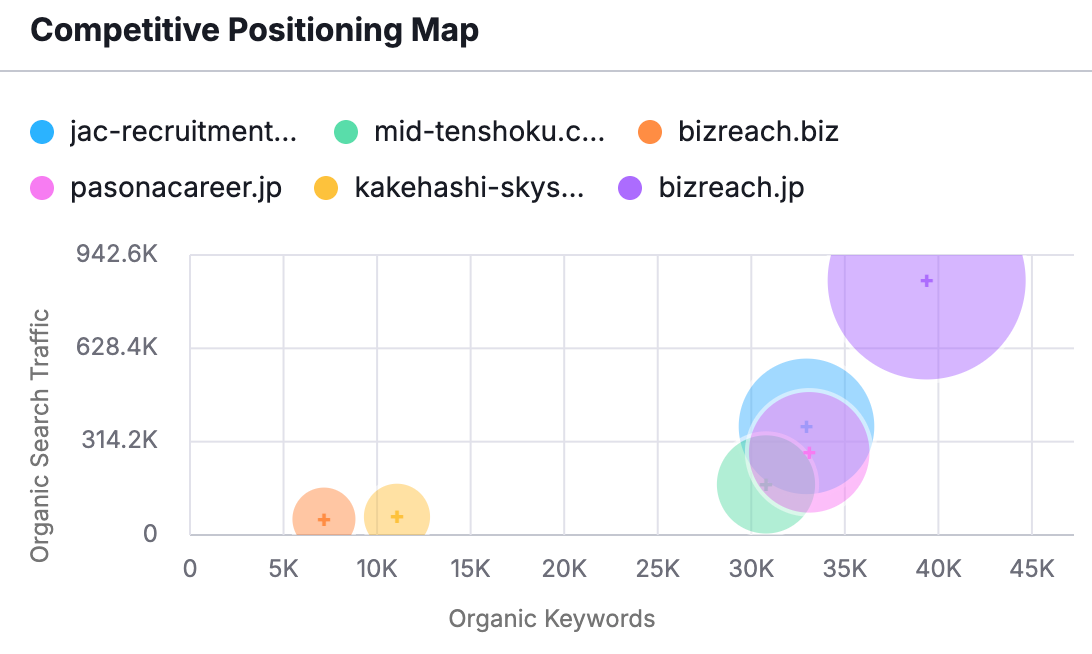 Here, we learn that the main organic search competitors to BizReach are recruitment consultancy JAC-Recruitment and En-Japan's mid-career website Mid-tenshoku. I therefore get the impression that BizReach is seen and used as a website for professionals to change jobs mid-career.
