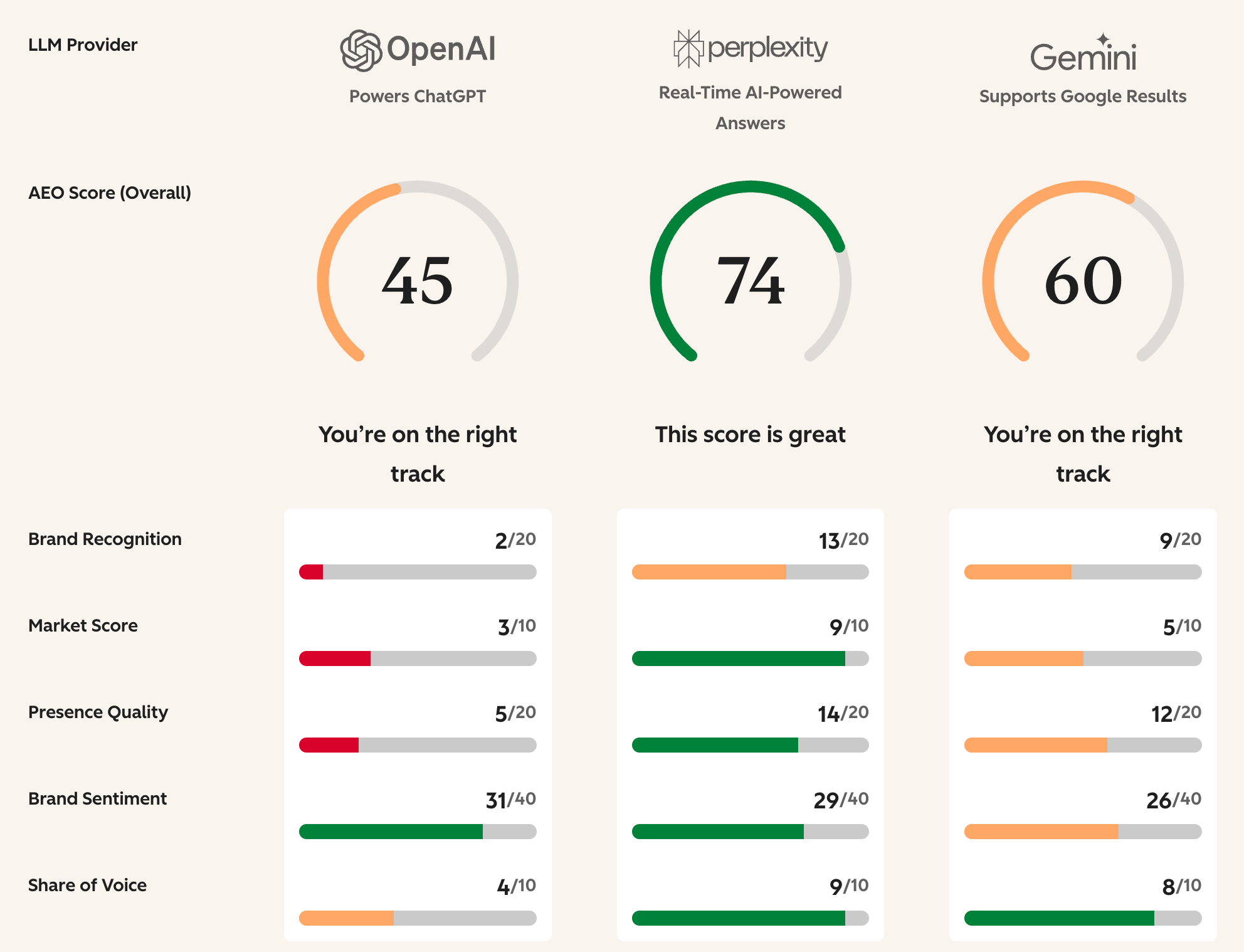 The brand sentiment is strong, suggesting that these tools view BizReach as a quality brand. The share of voice for Gemini is high, indicating it's frequently mentioned in search results. And it's mentioned more frequently than competitors Doda X and Recruit Direct Scout.