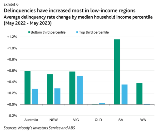 We’re seeing early signs of mortgage delinquencies rising, though from low levels. According to Moody’s, the delinquency rate among the bottom third percentile went up 0.6 percentage points from May 2022 to May 2023.