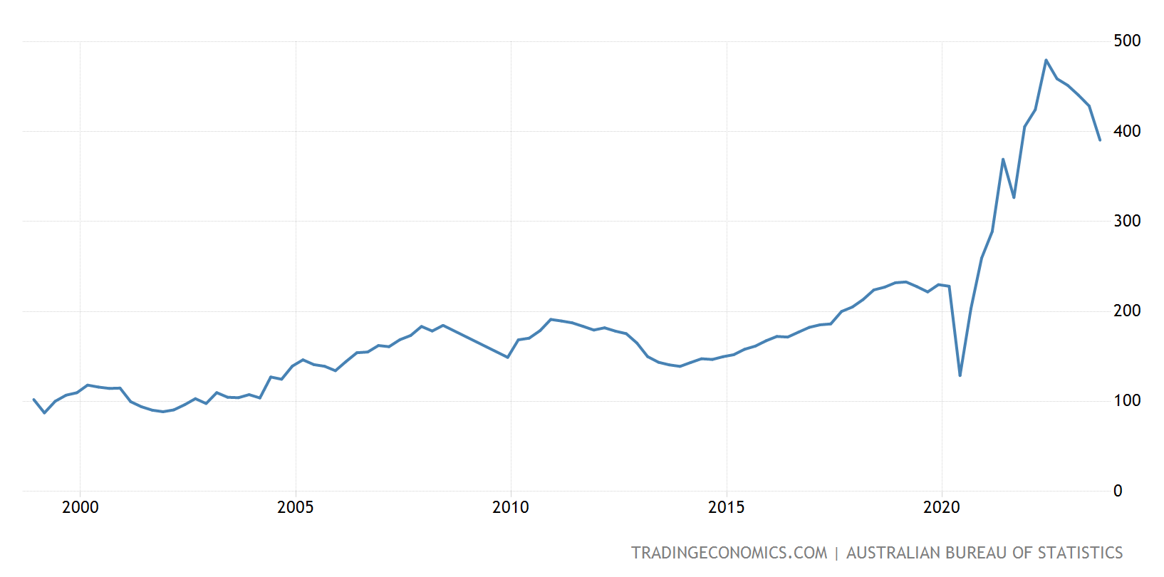 But the boom was also driven by migration flows from mainland China and elsewhere. Many Chinese saw Australia as a desirable place to live. You can tell from the following chart that net overseas migration accelerated from the mid-2000s onwards, with the population growing 1-2% per year.