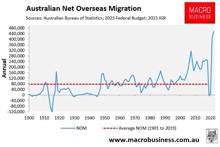 During most of the 30-year boom, dwelling completions stayed around 150,000, just in line with household formation. These provided enough housing for about 400,000 people, assuming an average household size of 2.7x individuals.