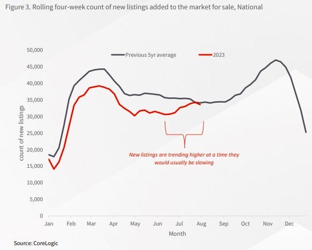 And in mid-2023, we started seeing an uptick in the number of new listings added to the market for sale, suggesting pain among existing homeowners: