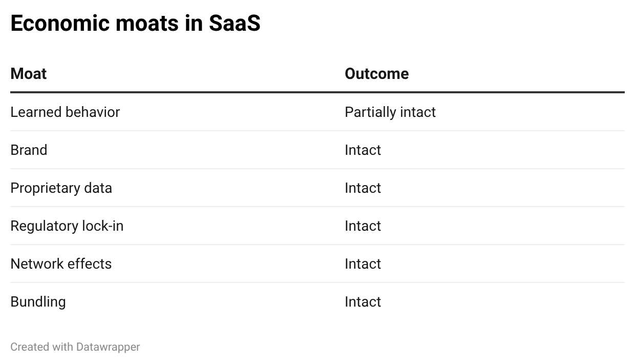 There's a strong case to be made that most of the typical software "moats" remain mostly intact:
