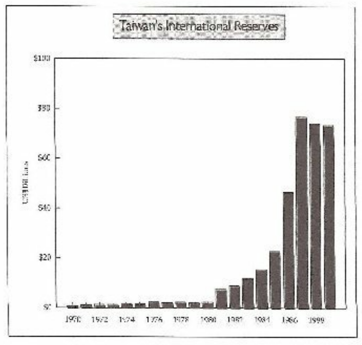 One consequence of booming exports and a fixed exchange rate was an accumulation of foreign exchange reserves. By the mid-1980s, Taiwan’s foreign exchange reserves were only slightly smaller than Japan’s - a country with five times the population. The reserves would grow even bigger before the decade was over.