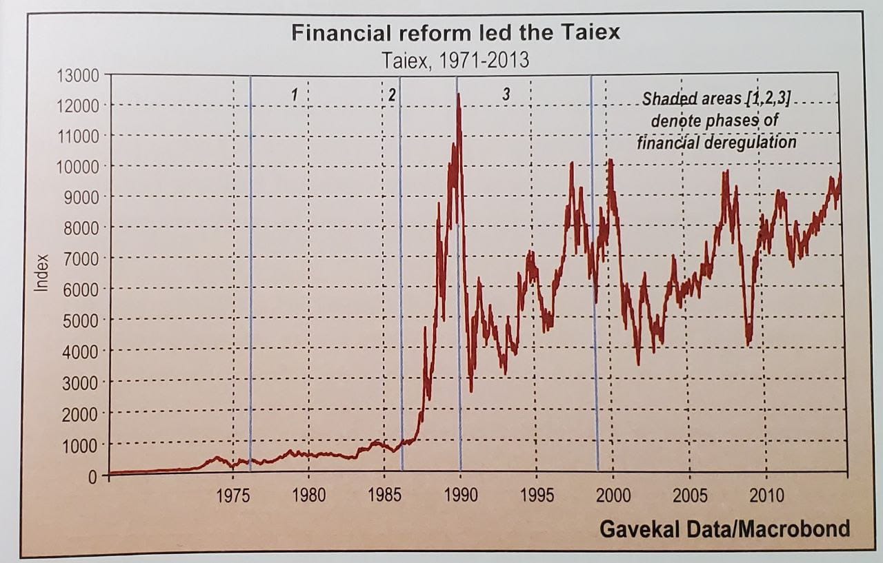 In 1985 - at an early stage of the bubble - the Taiwan Capitalization Weighted Stock Index (Taiex) was trading around the 700-mark. It had come off a bit from a previous high in 1984, but not many people were paying attention to the market yet. That would soon change.