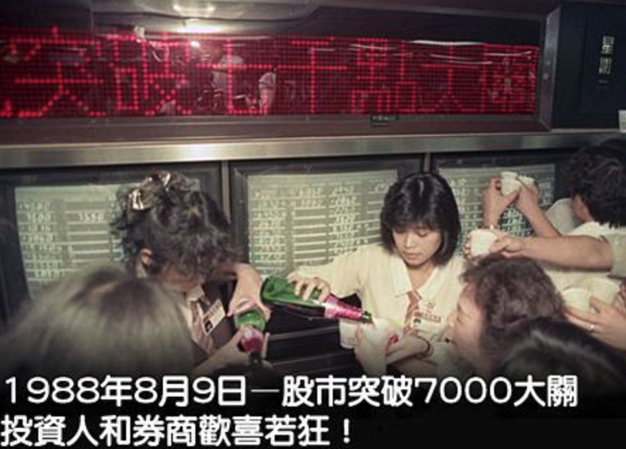 In 1988, Taiex broke through the 7,000 mark - up over 10x since 1985. In brokerage offices, retail investors celebrated with champagne and happy faces.