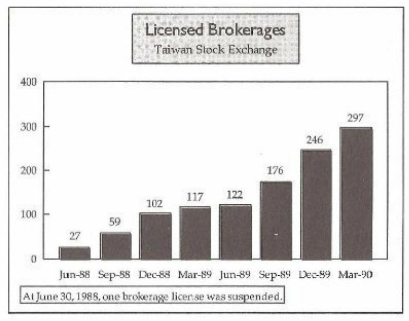 The central bank issued new brokerage licenses and eased listing requirements. There was a huge increase in the number of licensed brokerages, from 27 in June 1988 to 297 in March 1990. Easily available but generally illegal, margin credit was provided through many of these brokers.