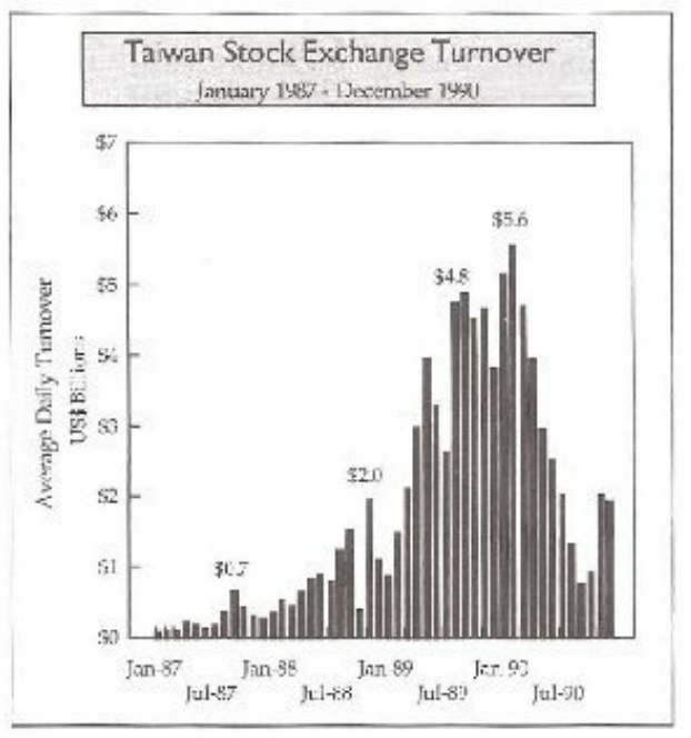 In 1989 every share of every company listed in Taiwan had changed hands just under six times. On peak days in February 1990, trading on the Taipei Stock Exchange exceeded the combined turnover of both the Tokyo and New York stock exchanges.