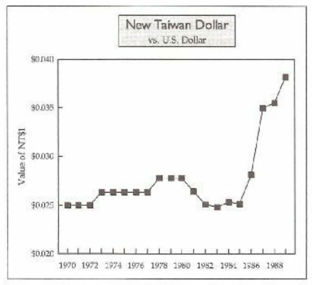 With booming exports, Taiwan’s current account surplus boomed and reached 19% of gross national income by the mid-1980s. As hot money flowed into the country, in 1985, the CBC finally allowed the Taiwan Dollar to appreciate: