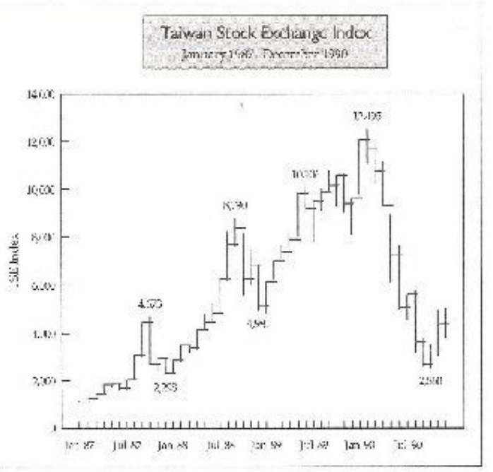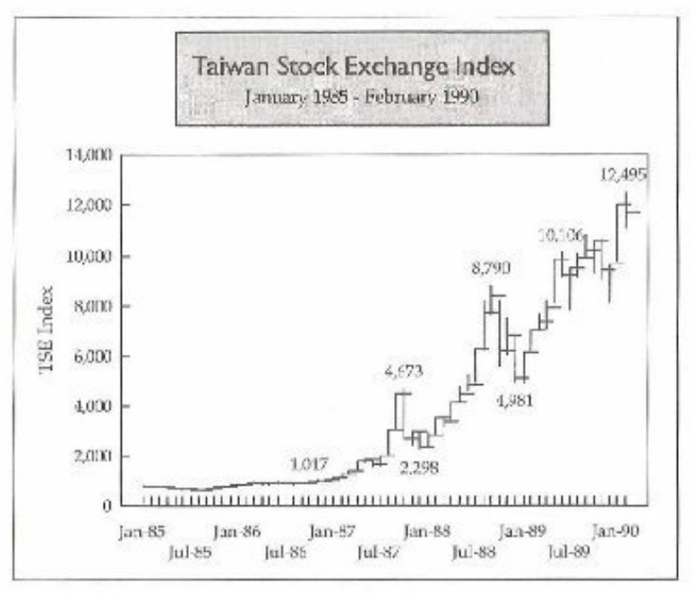 The compounded return over the previous five years had hit international records. The Taiex had gone from 1,000 points in 1986 to 12,000 in 1990. Stock prices multiplied by more than twelve times in less than four years.