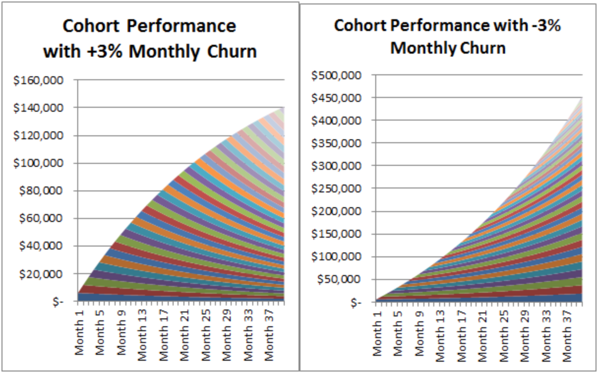 With negative churn, the company will enjoy an acceleration in revenue growth over time and a parabolic rise in revenues. In other words, each cohort of paying customers will pay more and more. Any new customers will then just add to the total, leading to an acceleration in revenues.