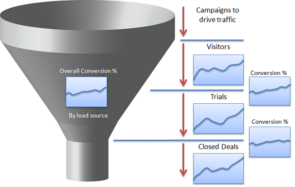 Conversion of new leads into paying customers can be pictured as a funnel that gets smaller based on some conversion rate. Many companies offer free versions of their software (the “freemium model”) and then up-sell value-added services for those who become paying subscribers.