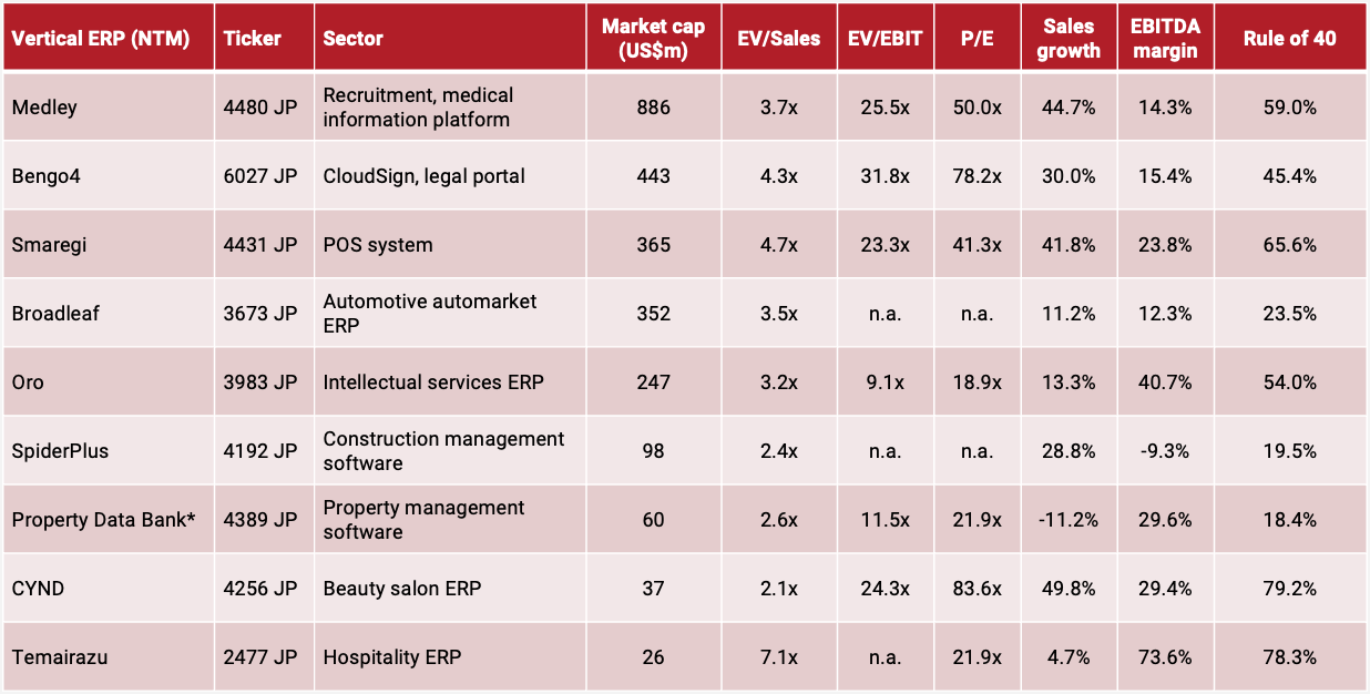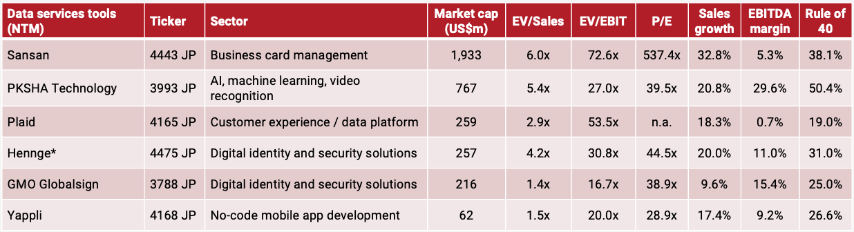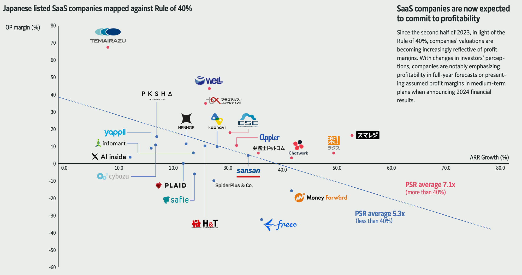 In terms of the Rule of 40, the ones that score best are hospitality booking system providers Temaizaru, Rakus and Chatwork (kubell). But bear in mind that sales growth can be volatile. And the latest sales growth numbers tend to be priced-in, anyway.