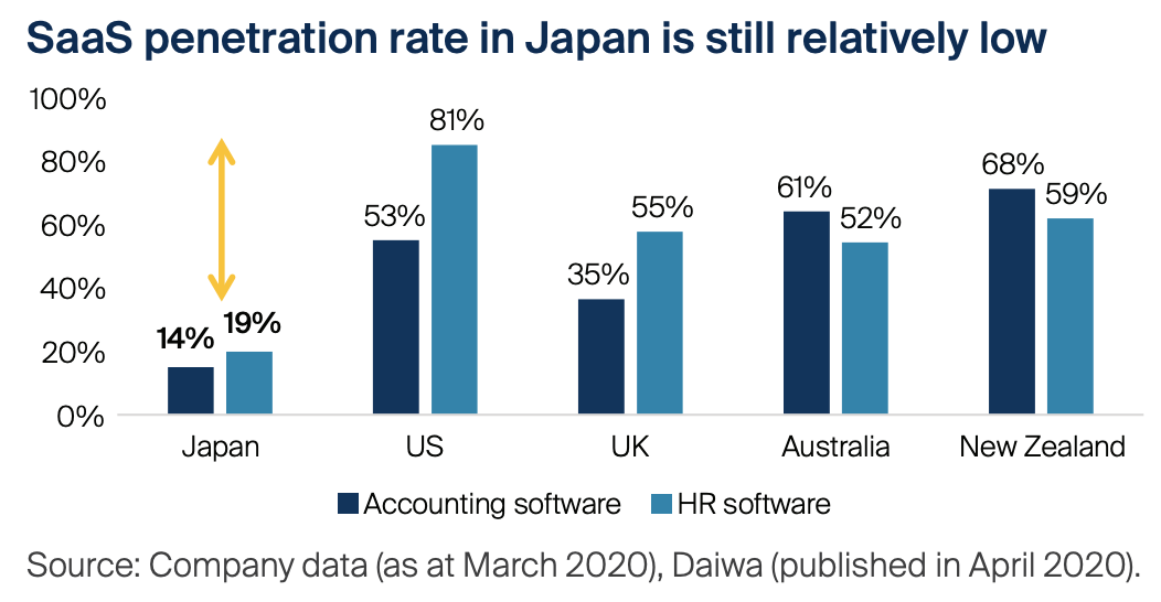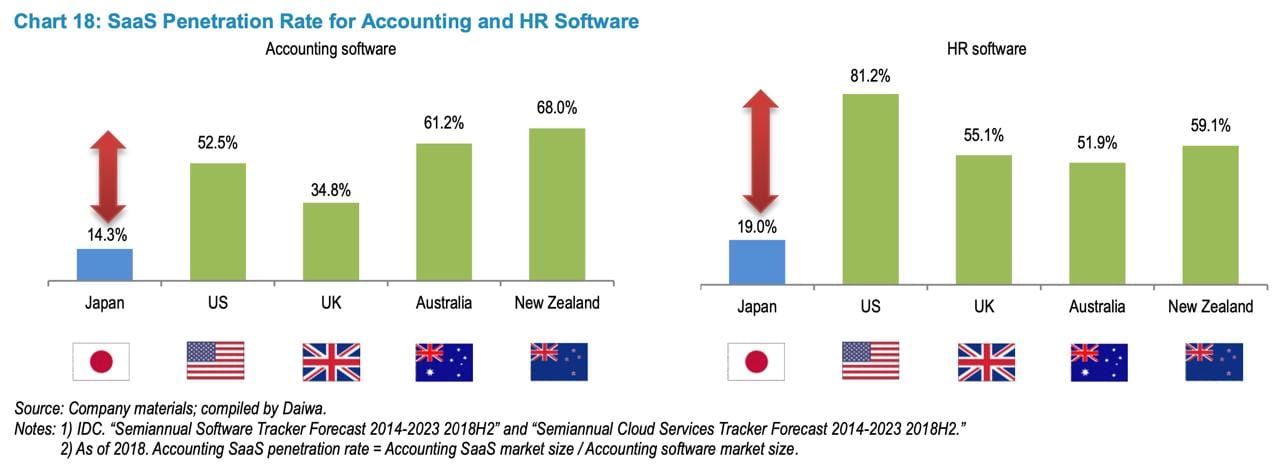 That 4x upside seems to hold true for several sectors. For example, within the accounting and HR software fields, Japan’s SaaS penetration rate is just a quarter of that of the United States.