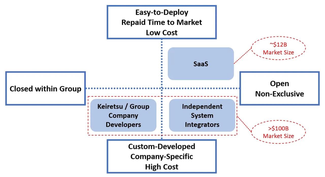 Driving this shift towards SaaS products is a move from on-premise software to cloud services. The Japanese software industry has been slow to change, having been dominated by hardware-centric manufacturing companies that place a low importance on software development. To the extent that SaaS products are developed, they’re often done so internally with sister companies or by system integrators. The software would only be used by a specific keiretsu, with software customized to its needs. The more conventional software developers include Fujitsu, NTT Data and Nomura Research Institute.