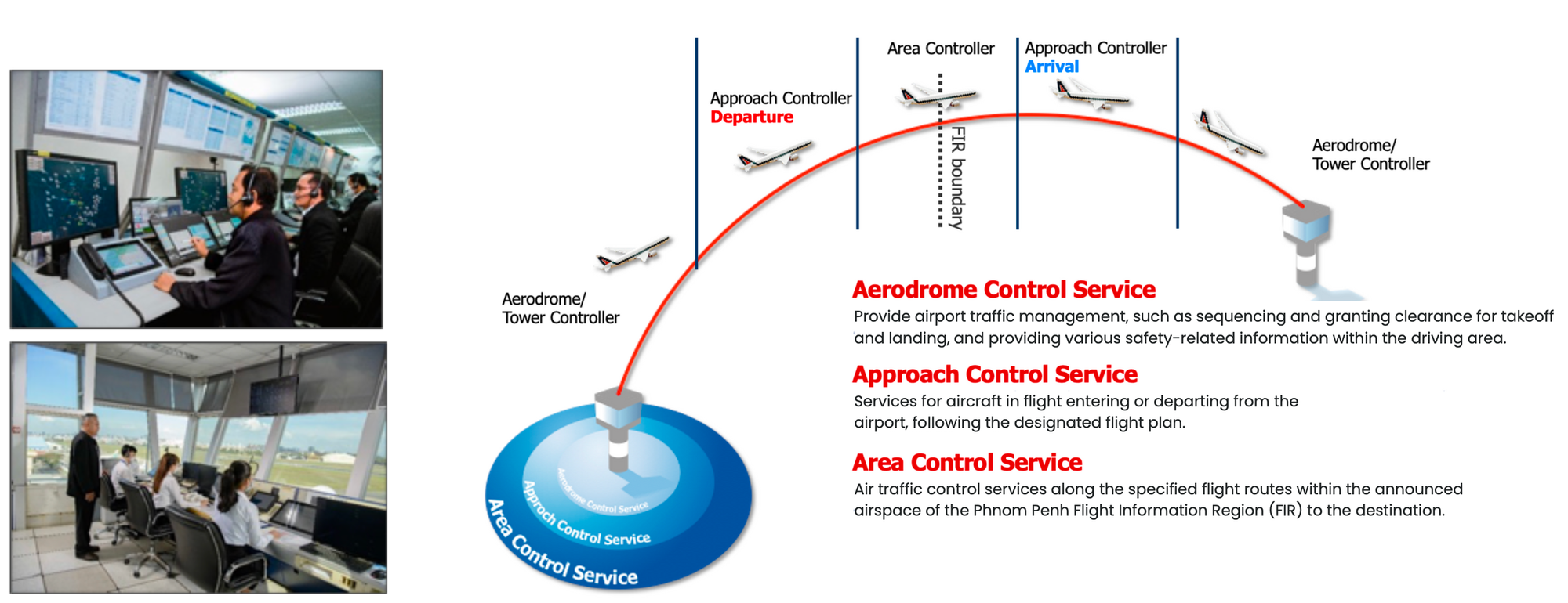 Such companies use control towers, radio systems, surveillance systems, etc to keep air traffic safe and orderly. Its 360 staff help sequence flights and grant clearance for takeoff and landing. It also manages all en-route traffic flying through Cambodian airspace — so-called "overflight" traffic.
