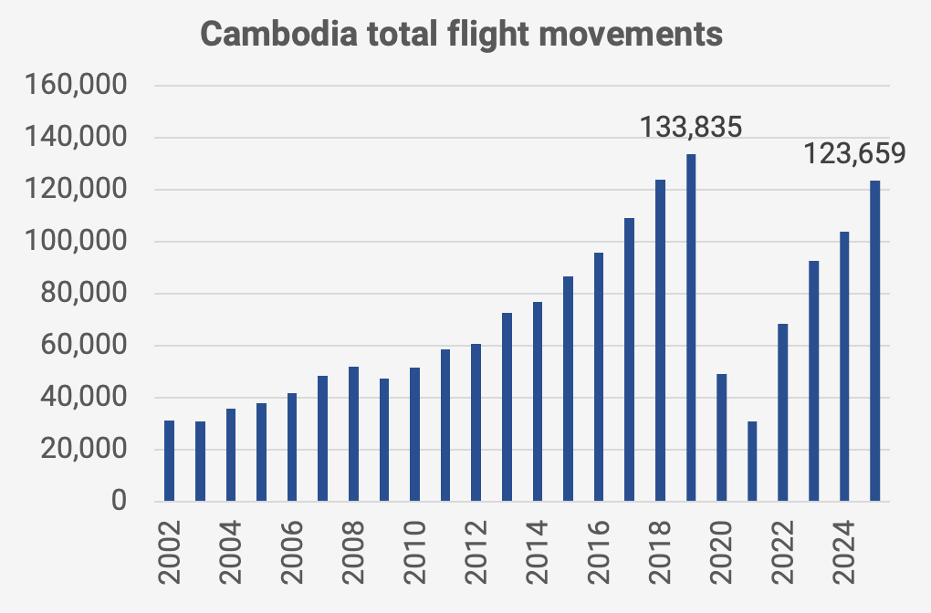 What's unique about the concession is that Cambodian air traffic is booming. Back in 2002, total flight movements in Cambodia were just 31,000 per year. In 2019, that number had risen to 134,000. There was a temporary dip in traffic during COVID-19, but we're now almost back to the pre-COVID level.