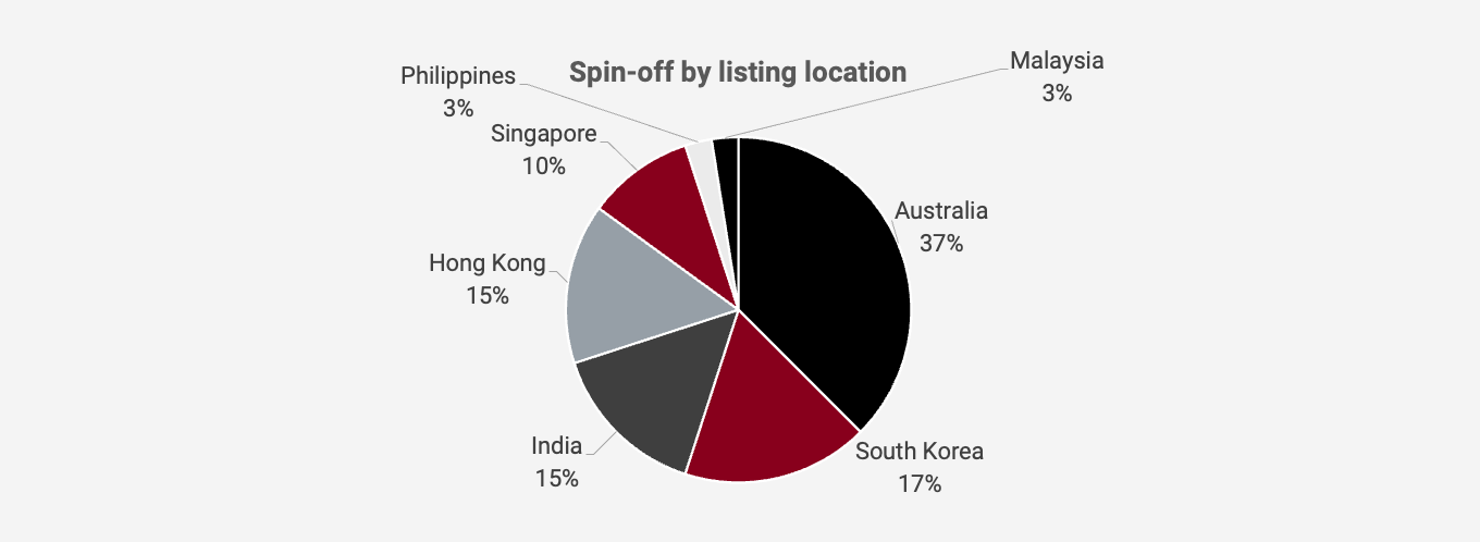 Out of these 40 spin-offs, most of them occurred in developed markets such as Australia, South Korea, Hong Kong and Singapore, along with a few cases in India, the Philippines and Malaysia: