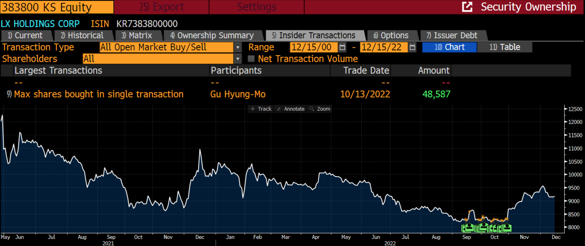 In September and October, there was a large insider buying by Koo Bon-Joon’s son Gu Hyung-Mo, who now acts as the new Vice President of LX Holding and owns 12% of the company. He must have seen value in the stock at around the KRW 8,000/share mark.