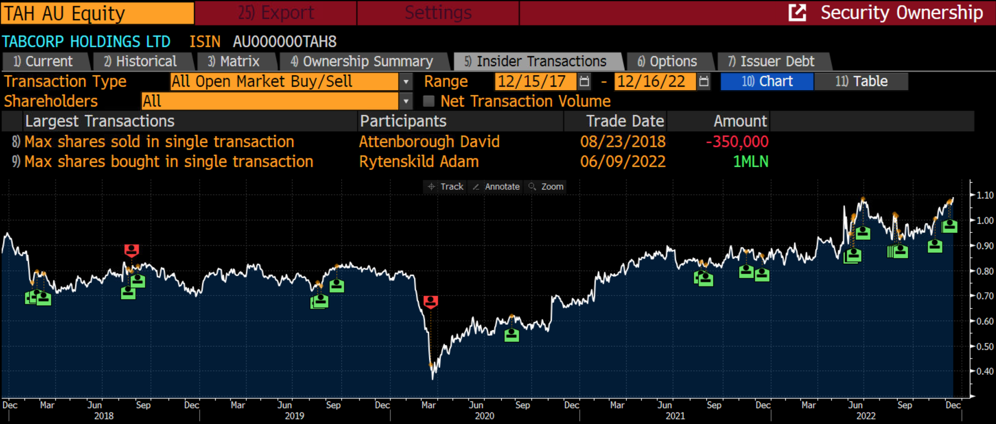 There’s been tons of insider buying in Tabcorp since the spin-off, including over a million shares by CEO Adam Rytenskild and almost a million shares by Chairman Bruce Akhurst. Those are positive signs, in my view.