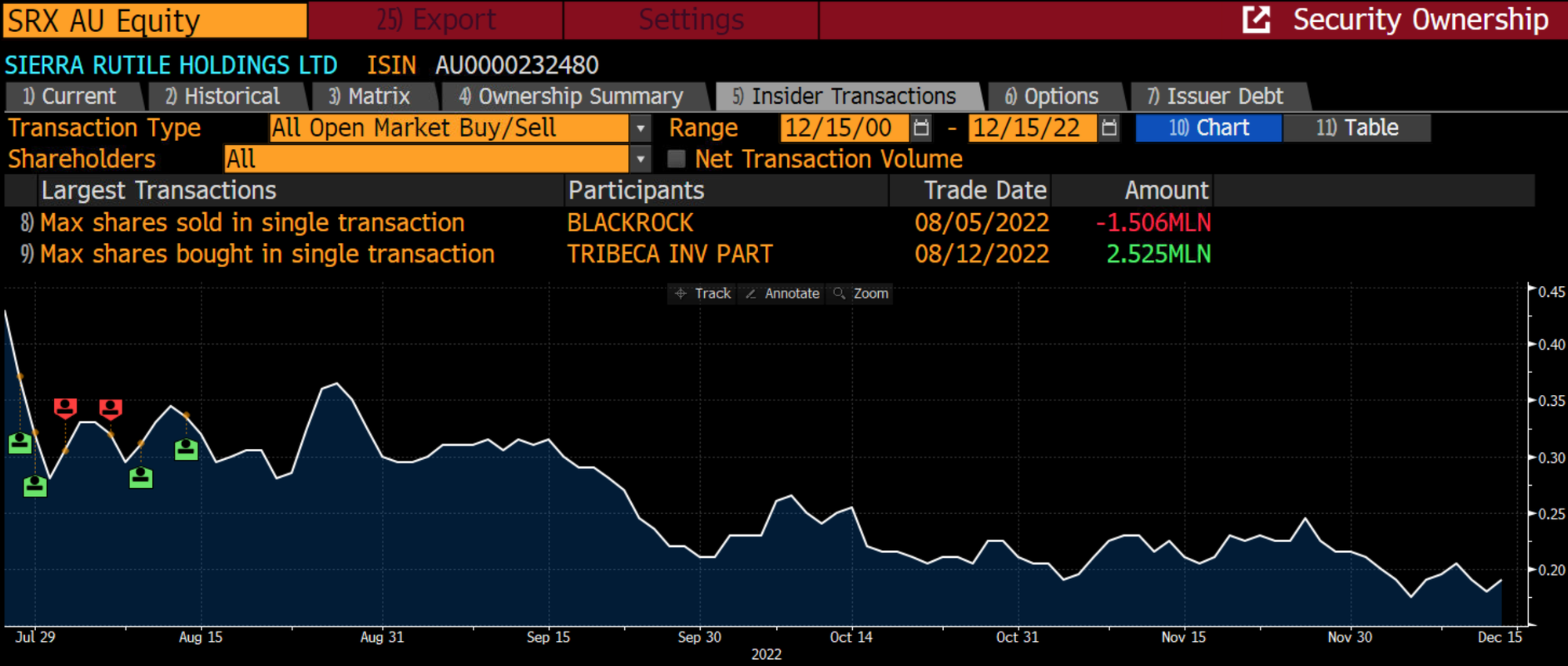Blackrock has been selling its shares in Sierra Rutile, while finance director Martin Alciaturi bought 100,000 shares recently. Sydney-based wealth management firm Tribeca Investment Partners bought 5 million shares a few months ago, possibly on behalf of somebody else.