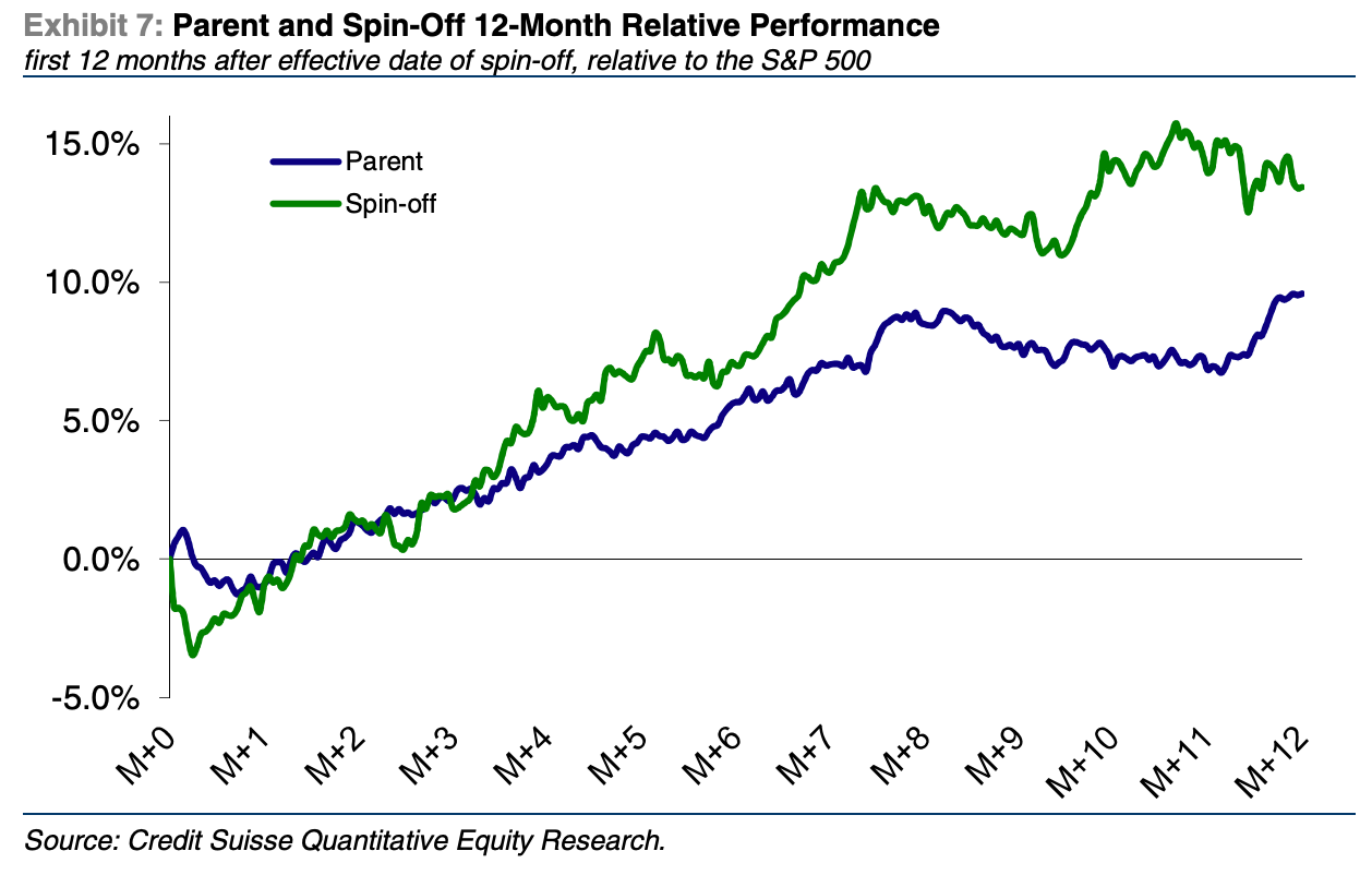 A 2012 study by Credit Suisse showed that spin-offs typically trade down about -4% vs the index in the first five days but proceed to recover over the next 30 days. And in the next 12 months, the parent / the spun-off entity outperformed the index by +10 percentage points / +13% percentage points.