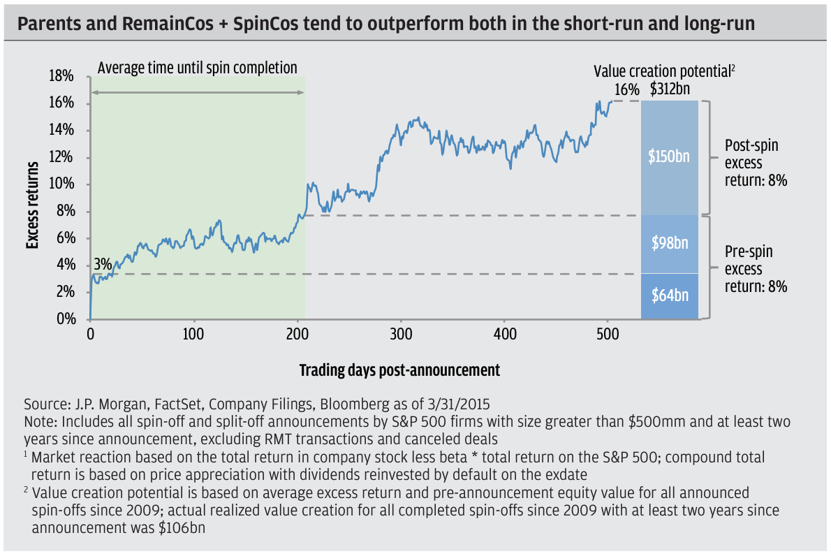 A 2015 study from JP Morgan found that during the first two years after a spin-off announcement, the combined market value of the two entities rose 16% on average, exceeding market returns by 8 percentage points.