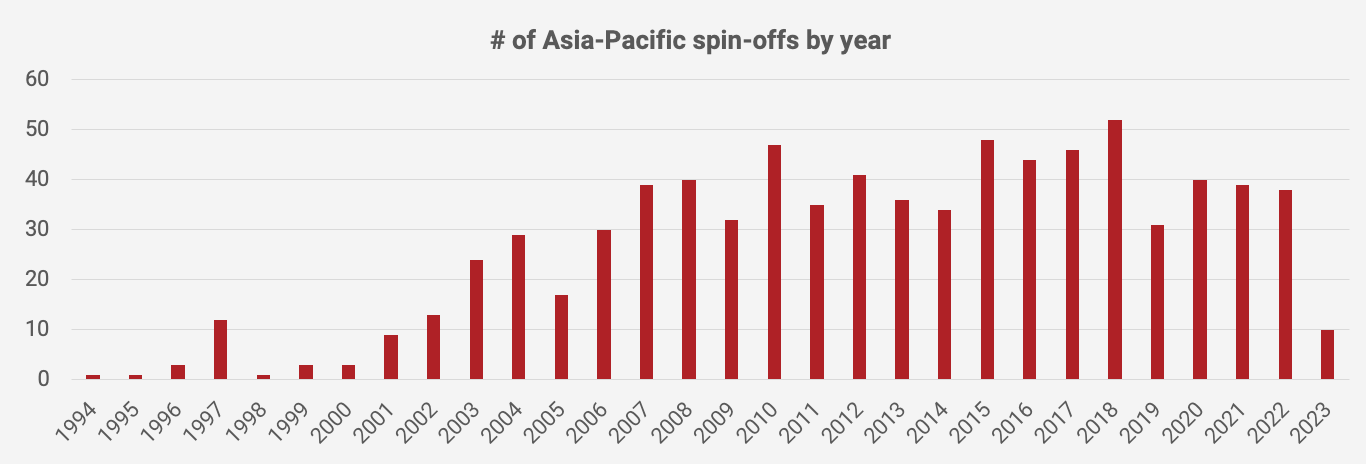 - Spin-offs are rare in the Asia-Pacific, but there are a few dozen per year in Australia and Asian developed markets such as South Korea, Hong Kong and Singapore. Since early 2021, there have been 40 spin-offs leading to two separately listed entities.