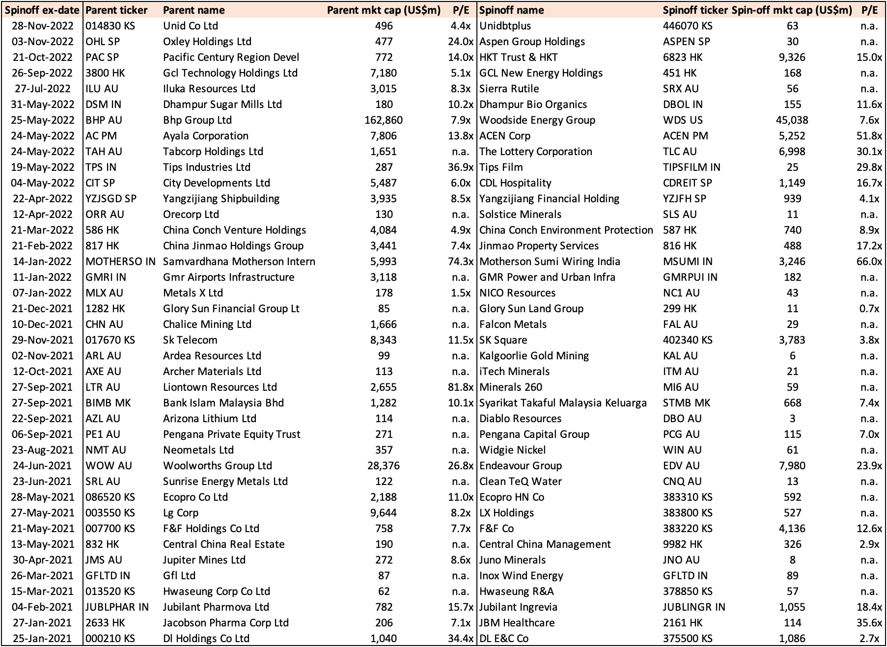 I downloaded a sample from Bloomberg of all the spin-offs that have taken place in the Asia-Pacific since early 2021. I used a parent market cap hurdle of US$50 million. That sample contains a total of 40 Asia-Pacific spin-offs.