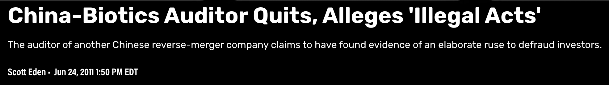 In early 2009, a short-seller pointed out that its 70% gross margins were hard to believe and that it had found large discrepancies with its SAIC filings. Later, private investigators found that many stores China-Biotics claimed to own did not exist. Finally, in 2011, auditor BDO resigned. It said it could not verify the cash balance that China-Biotics claimed to own and refused to certify the company’s 2011 numbers. After failing to file a 10-K, it entered into a trading halt.