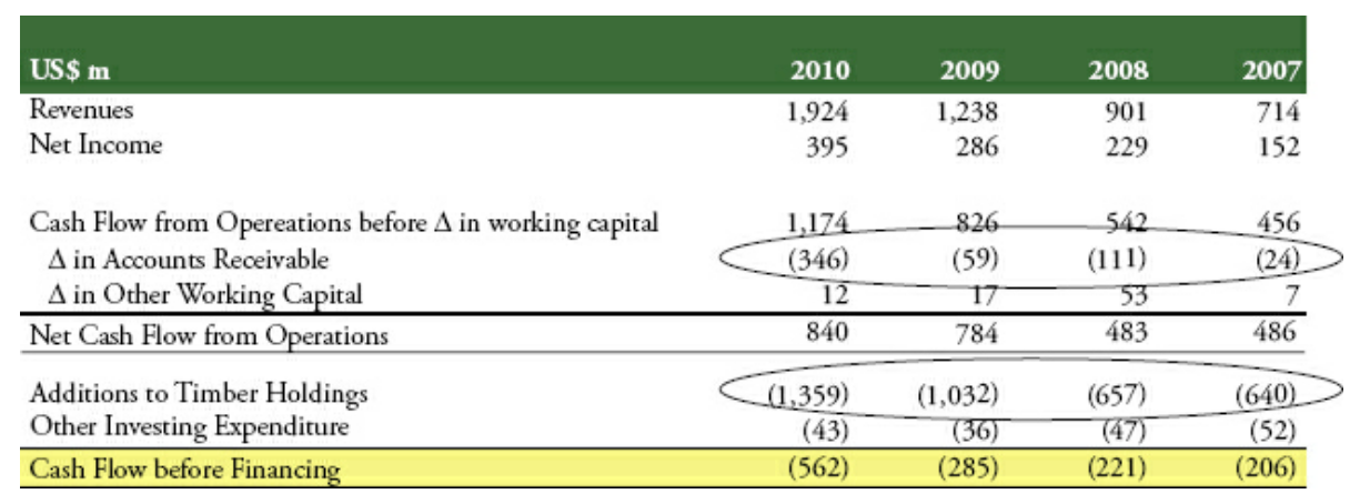 It was supposedly China's largest private forestry operator, with 790,000 hectares of forestry assets. The company had listed on the Toronto Stock Exchange through a reverse merger and then raised about US$3 billion through debt and equity. By 2011, it traded at a market cap of US$4.5 billion. It showed amazing financial metrics with EBITDA margins as high as 60-70%.