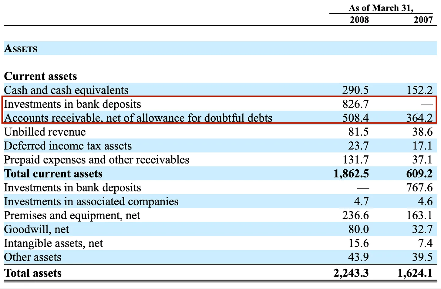 An unusual item on the balance sheet called “investments in bank deposits” was treated separately from cash. It didn’t earn much interest, which was suspicious in and of itself.