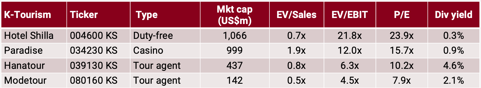 Finally, let's talk about tourism. A recent survey showed that 32% of young visitors to Korea cited Hallyu content as their primary reason for visiting. Tour agents such as Hanatour and Modetour should benefit, though I will admit that the younger generation tends to be less interested in group travel. Korean casino operator Paradise could benefit from greater inbound tourism, as could Korean duty-free operator Hotel Shilla. And I think Korea will likely benefit from the ongoing shift in Chinese tourism away from Japan to other countries.