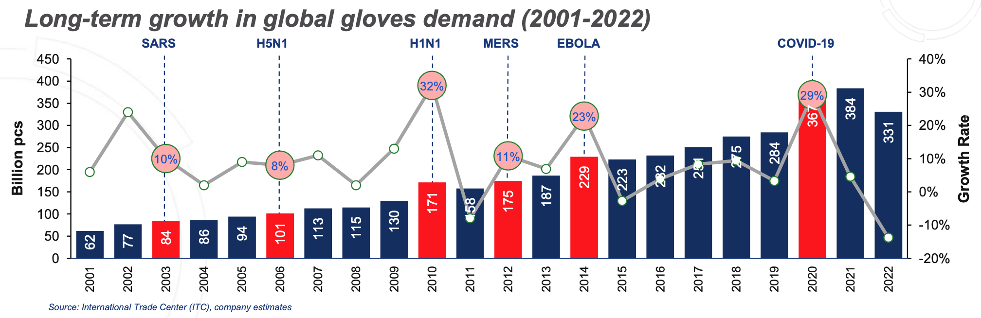 The glove industry enjoys secular demand growth of about 10% per year. But since the outbreak of COVID-19, the industry has experienced a boom-bust period that has yet to end. The current cycle was made worse because glove makers accumulated cash during the pandemic and used it to expand capacity.