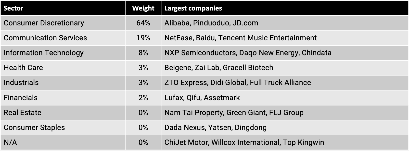 But within the sectors called “consumer discretionary” and “communication services” you’ll find many tech companies such as Alibaba and JD.com. Here are the largest companies in each of the above sectors.