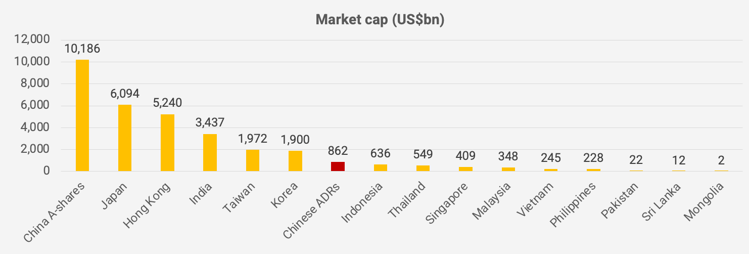 Summing up the market caps of all Chinese companies listed in the United States, you get to US$860 billion, making the market bigger than Indonesia but smaller than South Korea.
