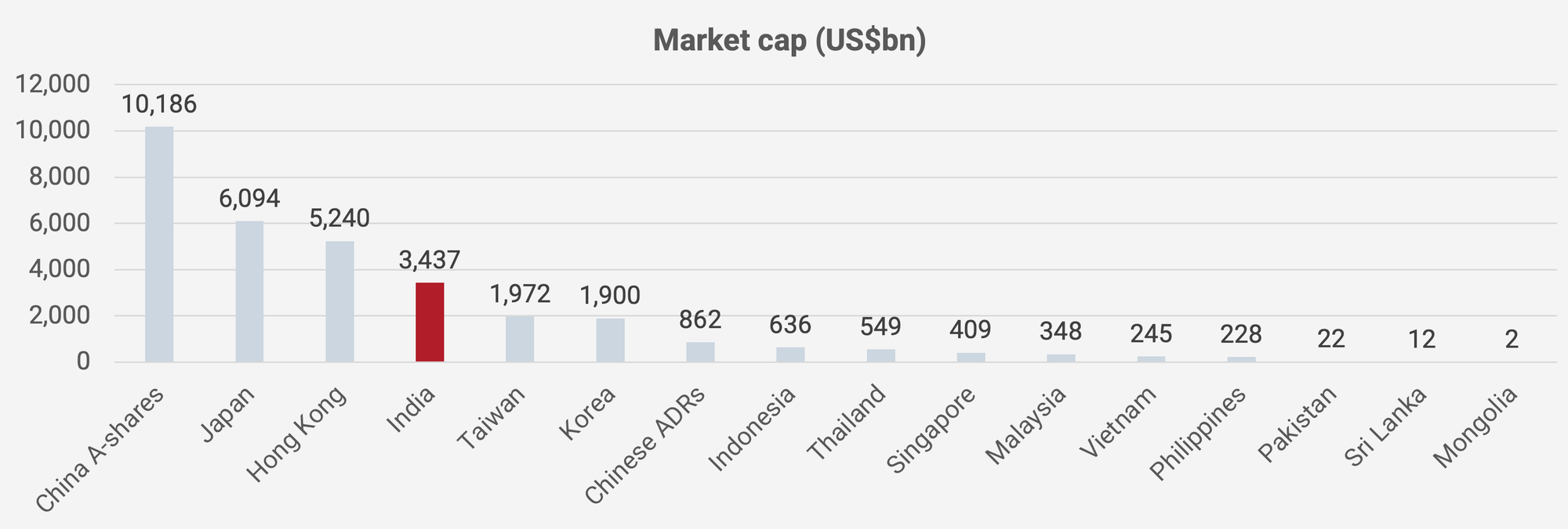 Regarding the stock market, there are over 5,000 stocks listed in India, though most of them with tiny market capitalisation. The domestic market ranks between Hong Kong and Taiwan.