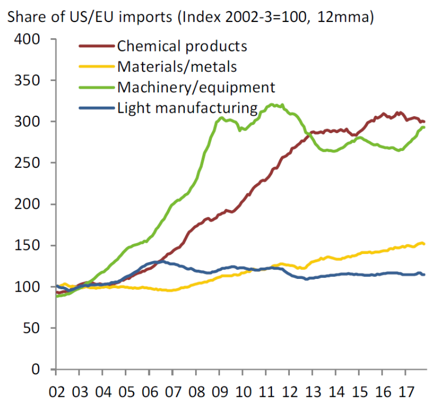 One chart is about India’s failed manufacturing sector. Rather than manufactured goods, the greatest success stories in the past two decades have been in service industries such as IT outsourcing, pharmaceuticals R&D, hospital tourism and so on. Meanwhile, India’s manufacturing sector has gone nowhere, as this chart from Emerging Advisors illustrates: